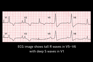23) ECG image shows tall R waves in V5–V6 with deep S waves in V1. Diagnosis?
