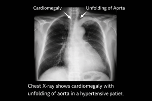 5) Chest X-ray shows cardiomegaly with unfolding of aorta in a hypertensive patient. This suggests?